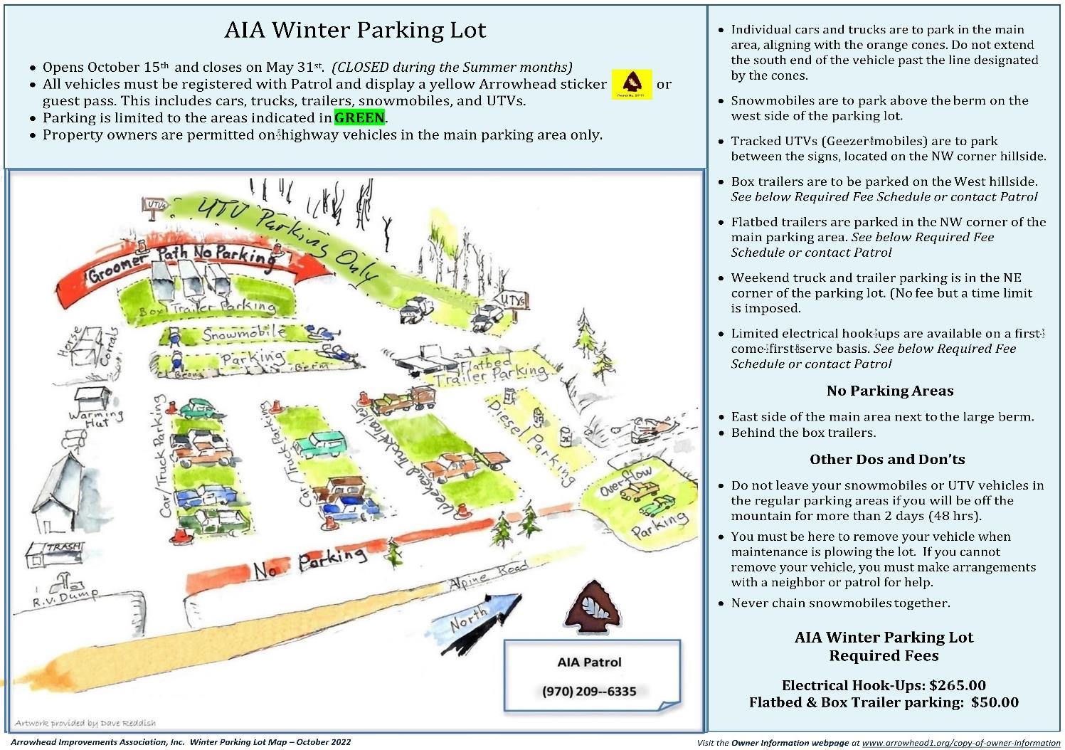Again, please monitor what you are placing in the dumpster. It is only house hold trash and there is a list on dumpster door what is not allowed. Fees for usage are $10 per month and can be paid to AIA office or Patrol can collect and give you a receipt.