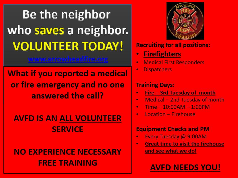 By supporting the Arrowhead Volunteer Fire Department, you are doing your part to provide emergency and non-emergency services to protect the lives and property of your neighbors in the Arrowhead Community.
