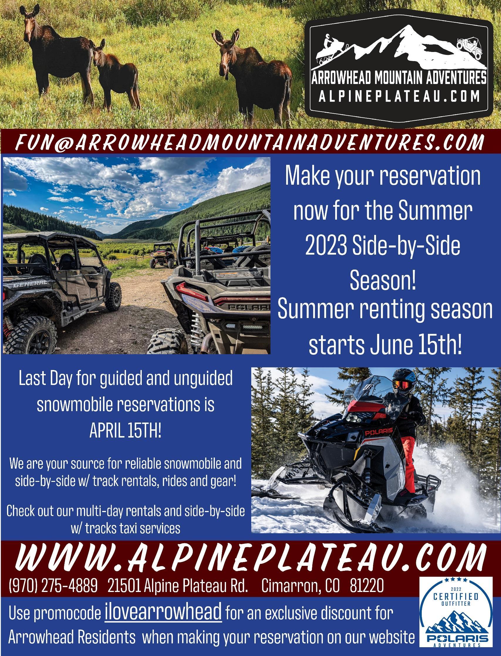 The Arrowhead Improvements Association Inc. is a state non-profit organization. The purpose of the Arrowhead HOA is to unite the property owners of the Arrowhead subdivisions in Cimarron, Colorado; to encourage civic improvements within said area, to encourage community activities including, but not by way of limitation, the beautification, maintenance and general appearance of vacant and improved lots, filing roads, winter parking lot, entrances, open and recreational areas situated within the area and used in common by its residents; enhance the safety of Arrowhead; facilitate enforcement of any and all building restrictions, protective covenants, and to otherwise act in the interests of the members of the Association.