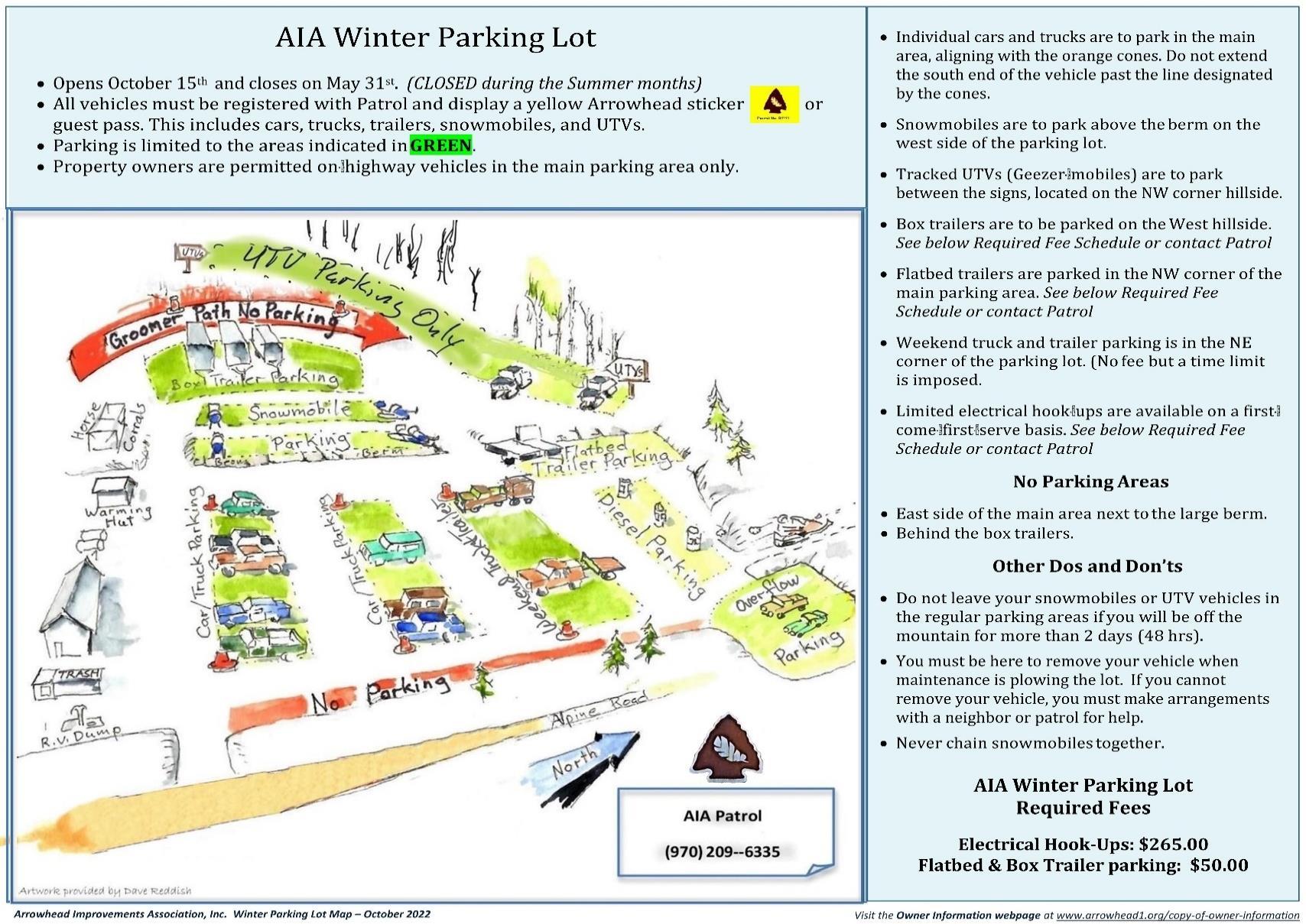 Street legal vehicles, snowmobiles, tracked UTVs and cargo trailers may be parked in the designated areas at the Winter Parking Lot after Sunday, October 15th . CLICK HERE to print/download a copy of the Winter Parking Lot information for your guest.