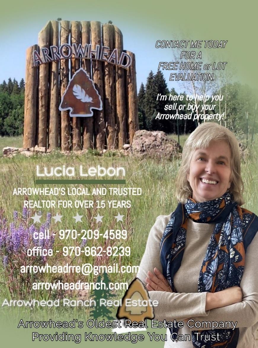 real estate advertised herein is subject to the Federal Fair Housing Law. The Arrowhead Improvements Association and its publication “Smoke Signals,” will not knowingly accept any advertising for real estate which is a violation of the law, either Federal or State. If you feel you have been discriminated against call the Colorado Civil Rights Division at 970-248-7329 or HUD 303-844-6158 or