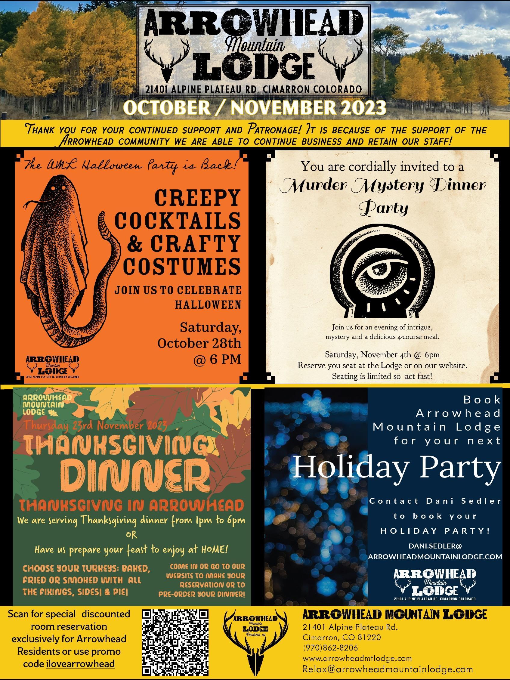 The Arrowhead Improvements Association Inc. is a state non-profit organization. The purpose of the Arrowhead HOA is to unite the property owners of the Arrowhead subdivisions in Cimarron, Colorado; to encourage civic improvements within said area, to encourage community activities including, but not by way of limitation, the beautification, maintenance and general appearance of vacant and improved lots, filing roads, winter parking lot, entrances, open and recreational areas situated within the area and used in common by its residents; enhance the safety of Arrowhead; facilitate enforcement of any and all building restrictions, protective covenants, and to otherwise act in the interests of the members of the Association