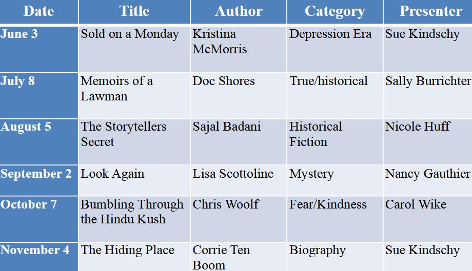 Questions: Contact Sue Kindschy at smkindschy@gmail.com January through May read, read, read and share what you would like us to read next year!! We meet the first Saturday of the month unless noted. Join us at the Arrowhead Mountain Lodge at 11:30 AM. All welcome! *July postponed a week due to the 4th of July holiday November will be held at Camp Robber, Montrose - 11:30AM