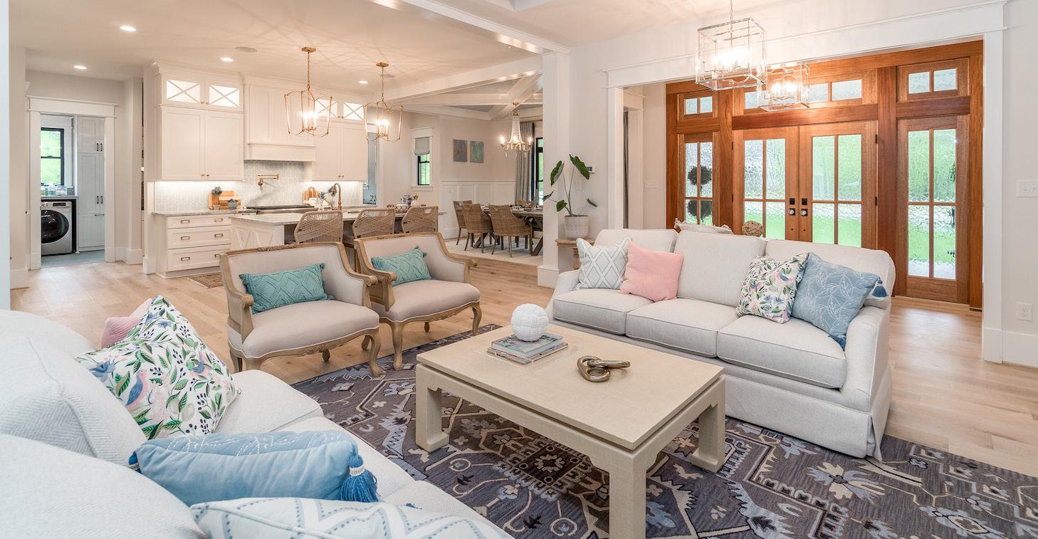 The interior of the home is bright and airy as natural light pours into the space and bounces off the walls. The ceiling height sitting 10 ft. overhead, stretching to 12 ft. in the family and harvest room where it goes virtually undetected. Trim line work added to the walls and ceiling are a subtle detail that makes the room feel even more spacious. As the trim runs up and carries across the ceiling it visually encourages the faces to merge, comprehended mentally as an endless room. This sensation is continuous throughout the interior.
