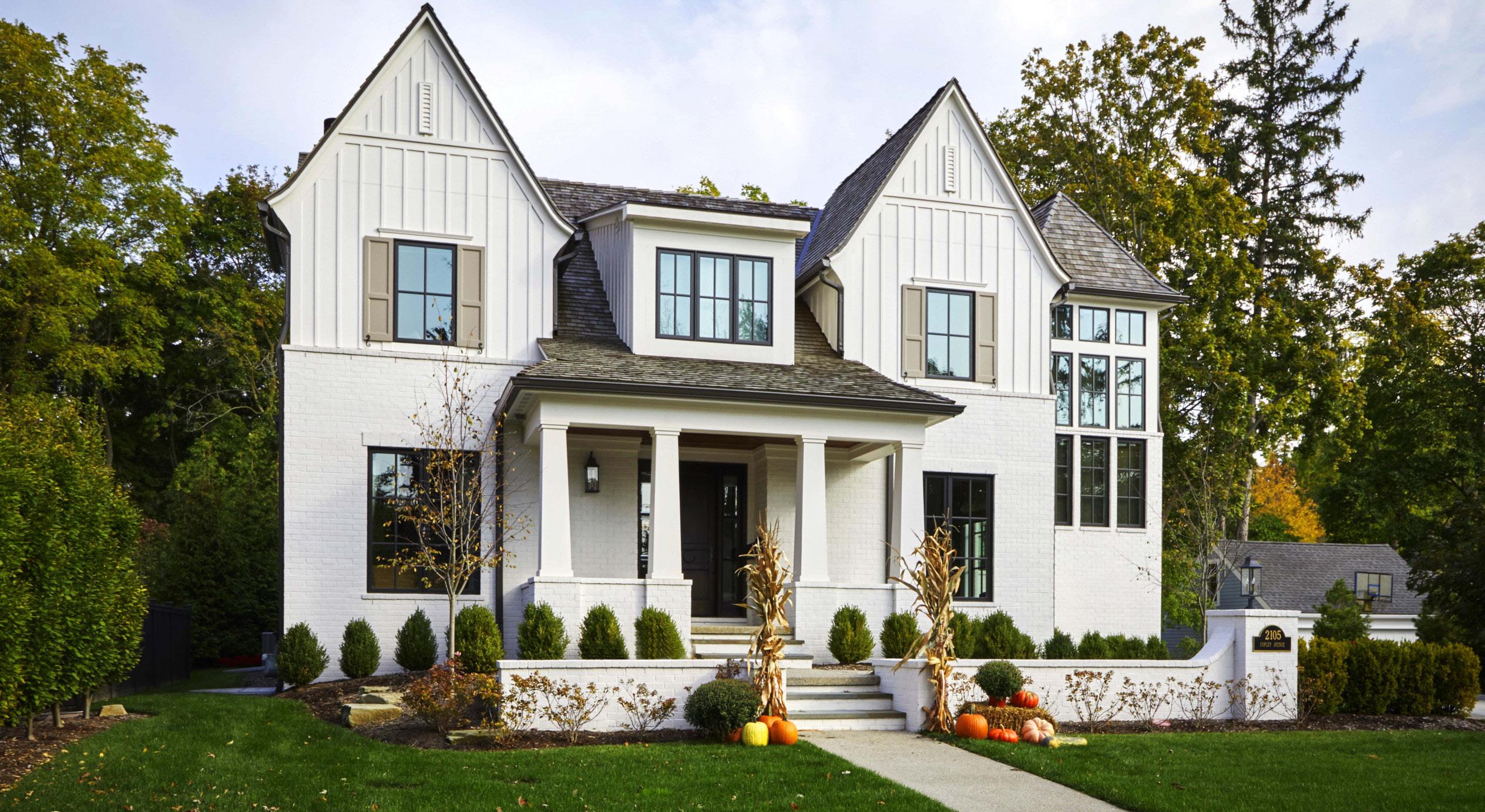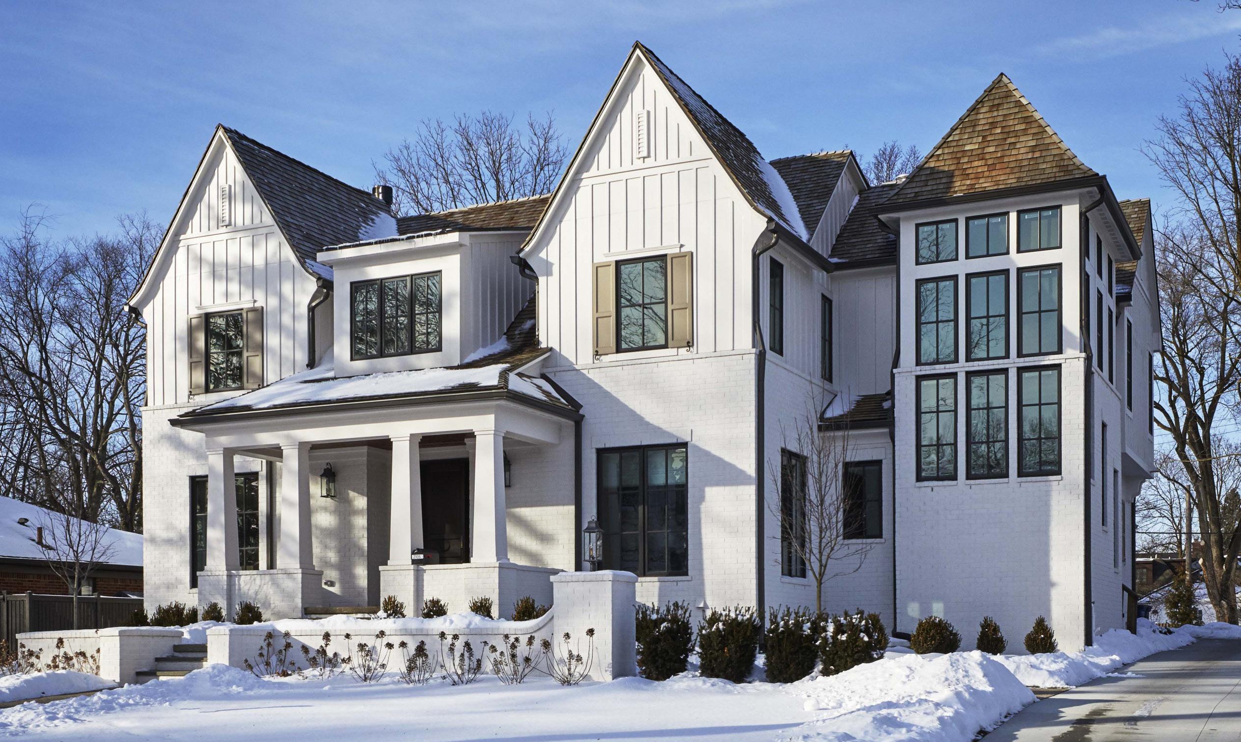 There is an undeniable elegance radiating from this Eclectic home. The eggshell tone that dominates the exterior works beautifully with the creamy beige shutters and shake shingles – a calm, enduring presence to take in. A symmetrical pair of gables stand tall over the porch centered below. The vertical board and batten siding leading the eye down to the entry, sending a warm welcome to visitors. Slightly set back on the façade, a third elevation presents an independent look. Three stacked rows of adjacent windows extend up to its hip roof, sending light into the staircase beyond. The windows pop through making themselves known, the line of the bold dark trim stands out against the light exterior.