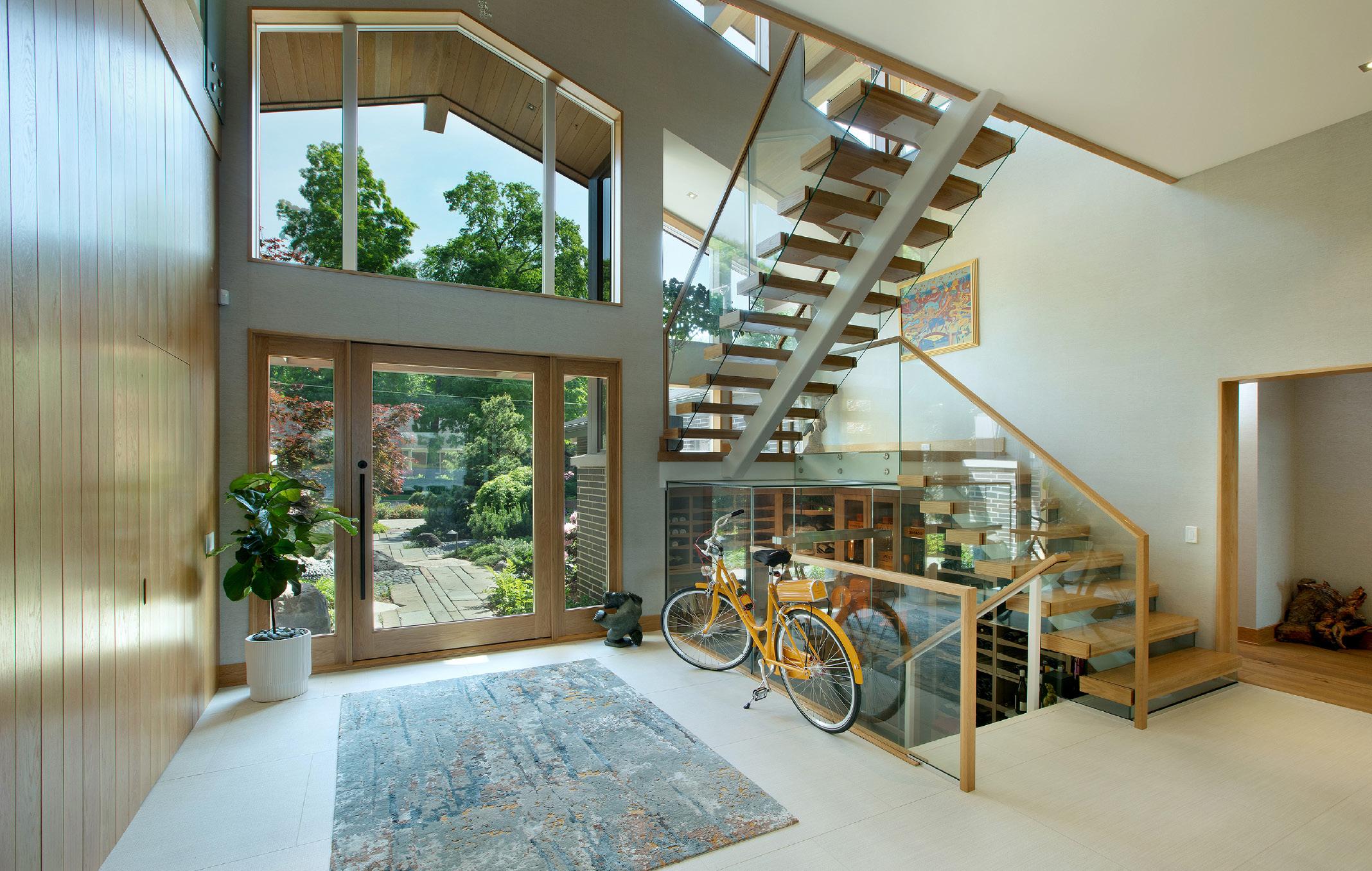 The original footprint informed the new open plan, with a focus on views to the large front yard and wooded rear yard. High sloped roofs direct water to river rock under eaves. Original pine framing was re-purpose to fur down vaulted ceilings. Demolished brick patio bricks were used in new chimneys.