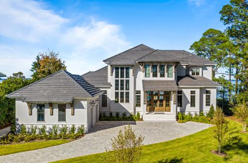 Inspired by the traditional hip-roofed covered front porches, high ceilings, and large windows of Low Country vernacular, this home is a respectful modern take on the architectural style. Its distinctive use of materials brings new contrast to the exterior façade, while gabled heights between the main house and accessory garage tucked to the side pay homage to the style. Intimate spaces are separated from the more public, gathering spaces visually and spatially through an interior layout that is organized along a central axis extending from curved, barreled entrance and foyer to the interior living spaces that extend through the covered patio to the outdoor patio and pool beyond.