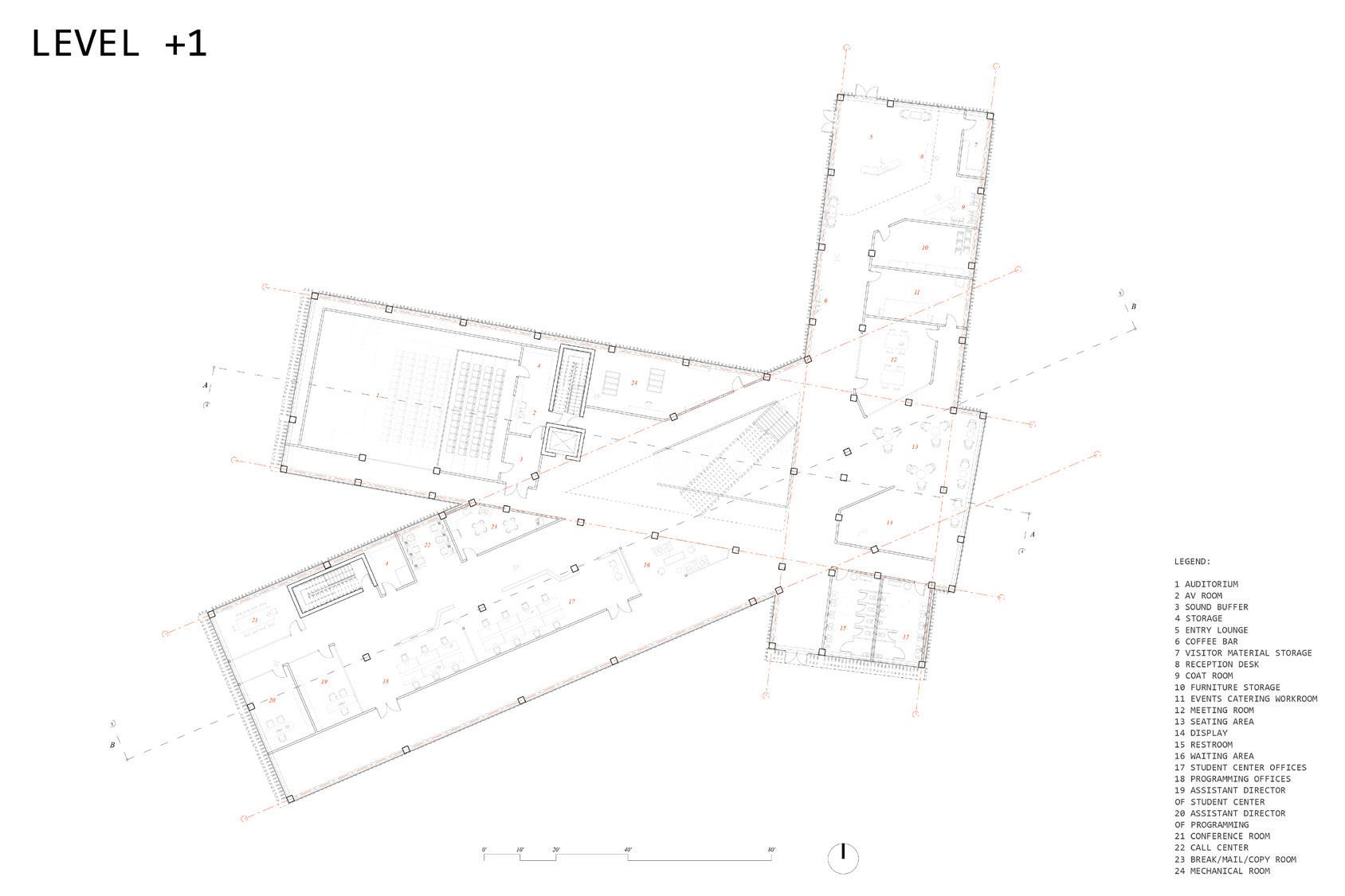 Three “pillars” of cadet life emerged when doing research on the Academy: military, academics and athletics. The design reflects the significance of these aspects of cadet life through the use of axes that point in the direction of important campus landmarks. We focused on expressing the idea of “axis” in every aspect of the design from form to structure to systems layout as well as how these formal architecture elements can influence the visitor experience.
