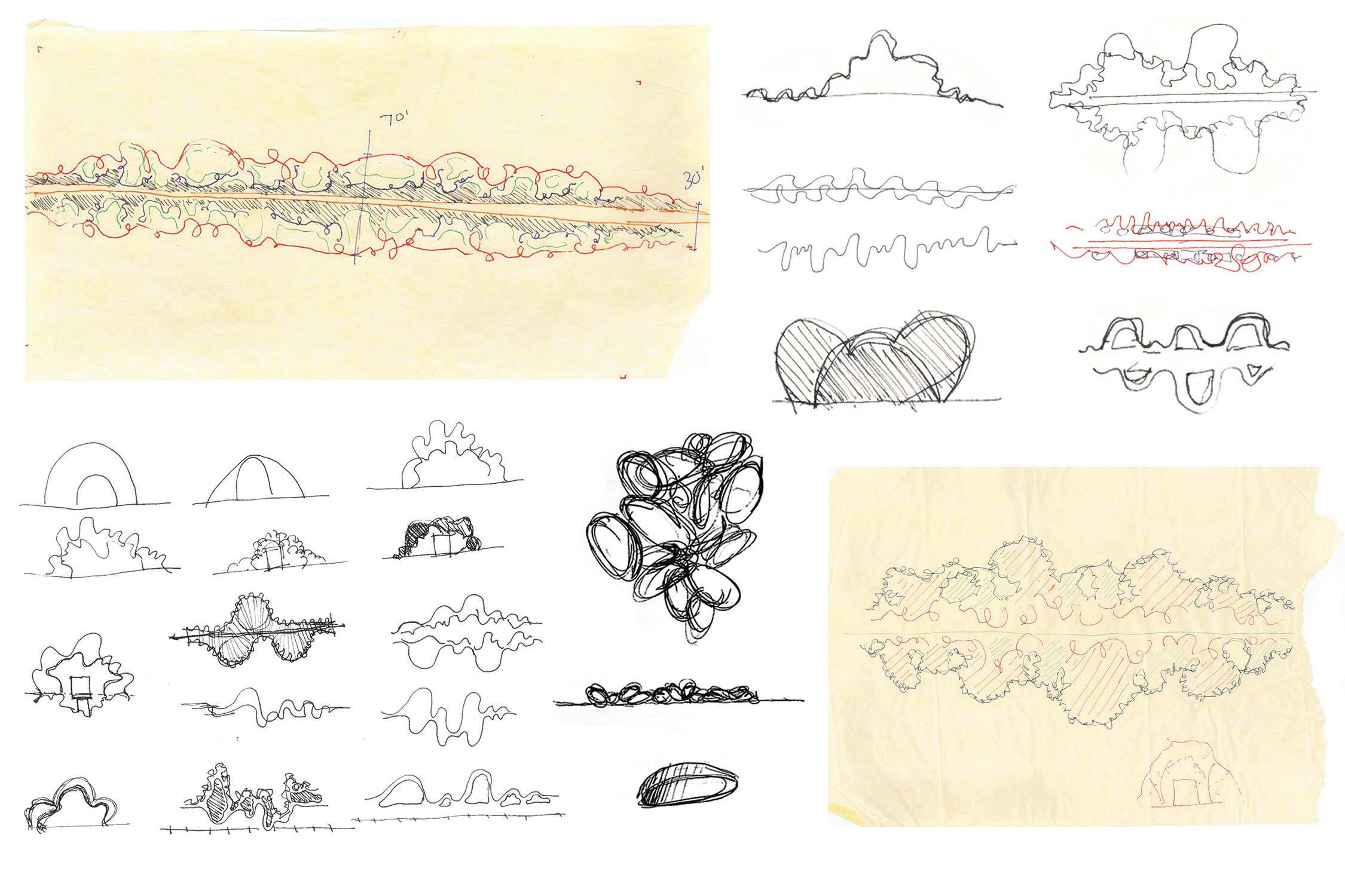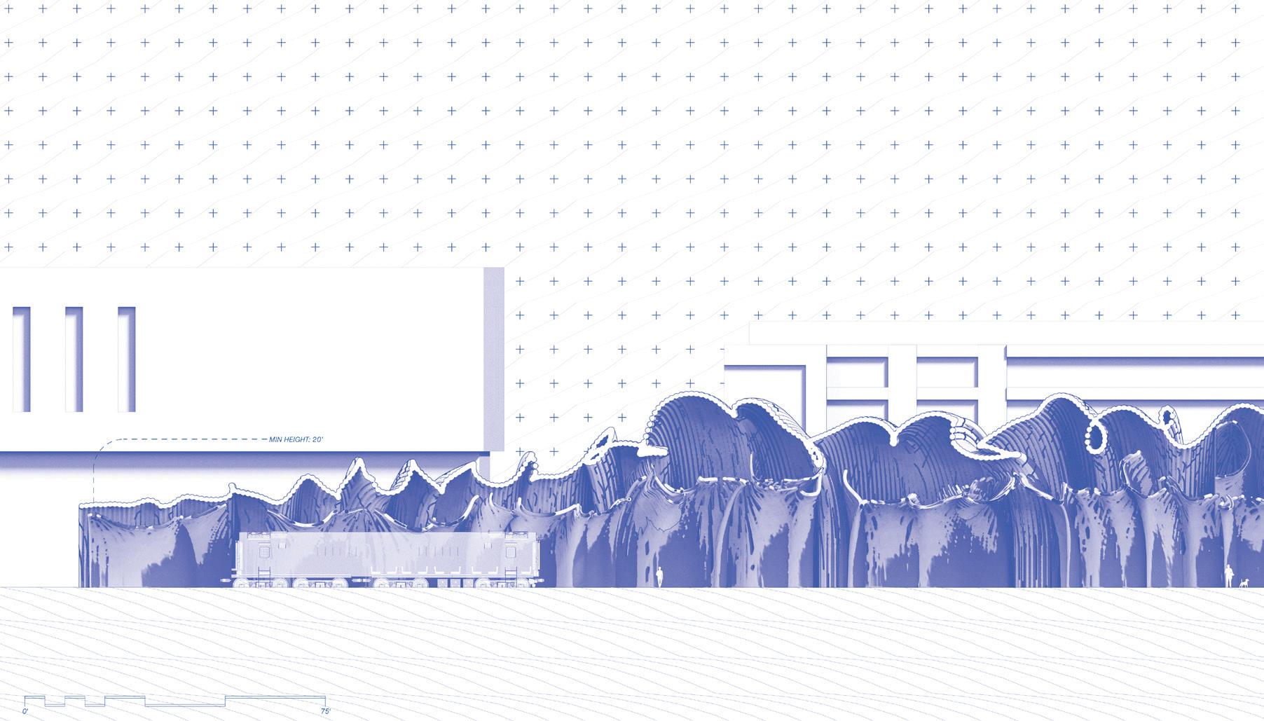 Channeling these concepts, our Texas A&M train station proposal studies how a form develops from a continuous curve that ribbons and folds in upon itself. Informed by the program, multiple sets of curves work to achieve the form and envelope the functions of the station. Within the delaminated layers and variance of these folds, structures and services will be integrated into the form itself. Specifically, the creases and depressions of the roof provide a functional opportunity for water to be captured, channeled, filtered, and then reused. This rainwater harvesting system supports the gardens and utilities within the station. Mimicking the ribboning of the river and rail typologies, this station channels patrons through its layers and folds to their final destination.