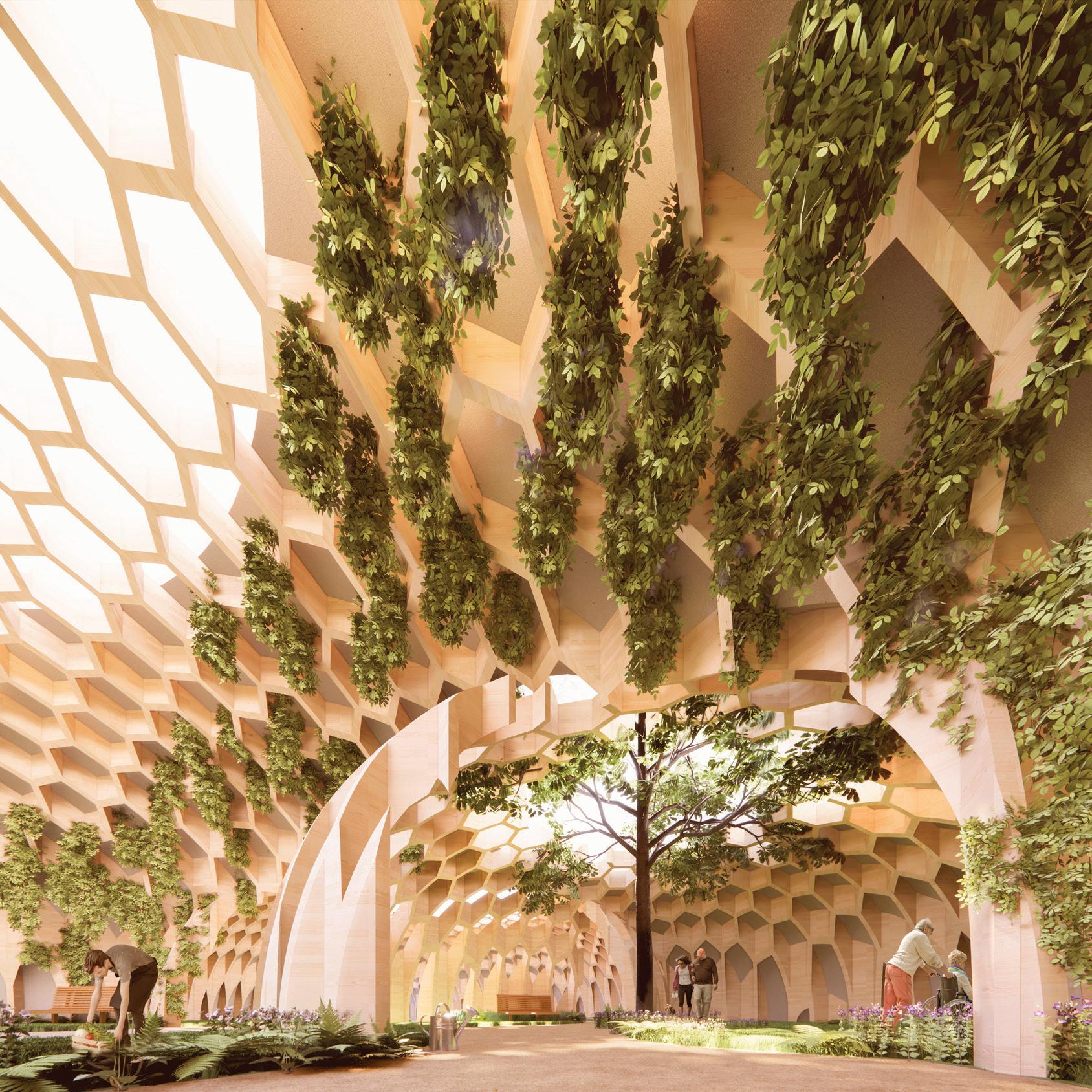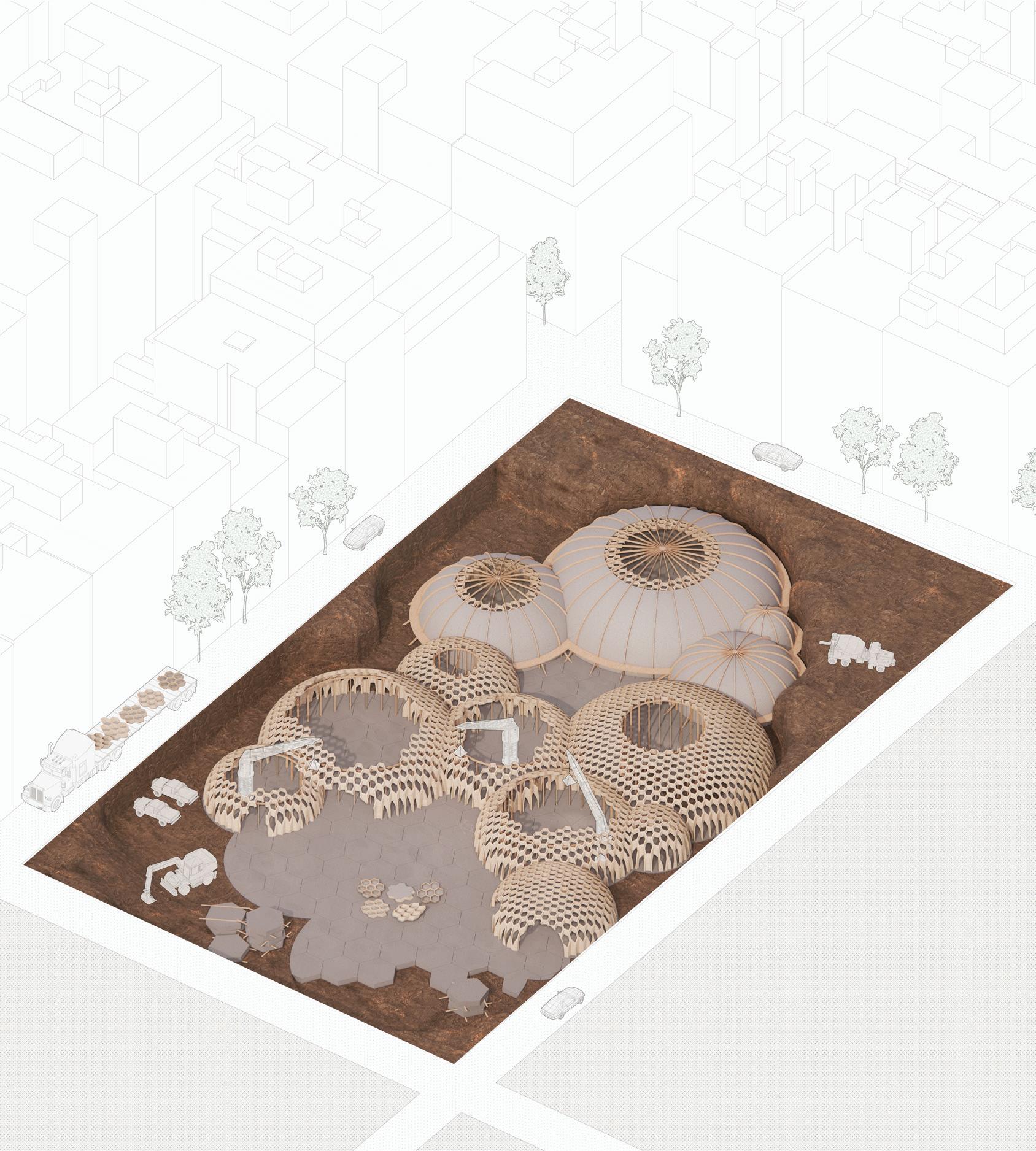 Due to the tight knit organization of the Gràcia neighborhood, we aimed to both ease the process of construction and diminish its footprint. The underground structure is made up of an assemblage of prefabricated glulam, hexagonal modules forming varying sizes of domes. The series of fifteen overlapping structural domes are perforated throughout, meaning no spaces are completely closed off reflecting the nonhierarchical organization of Gràcia.
