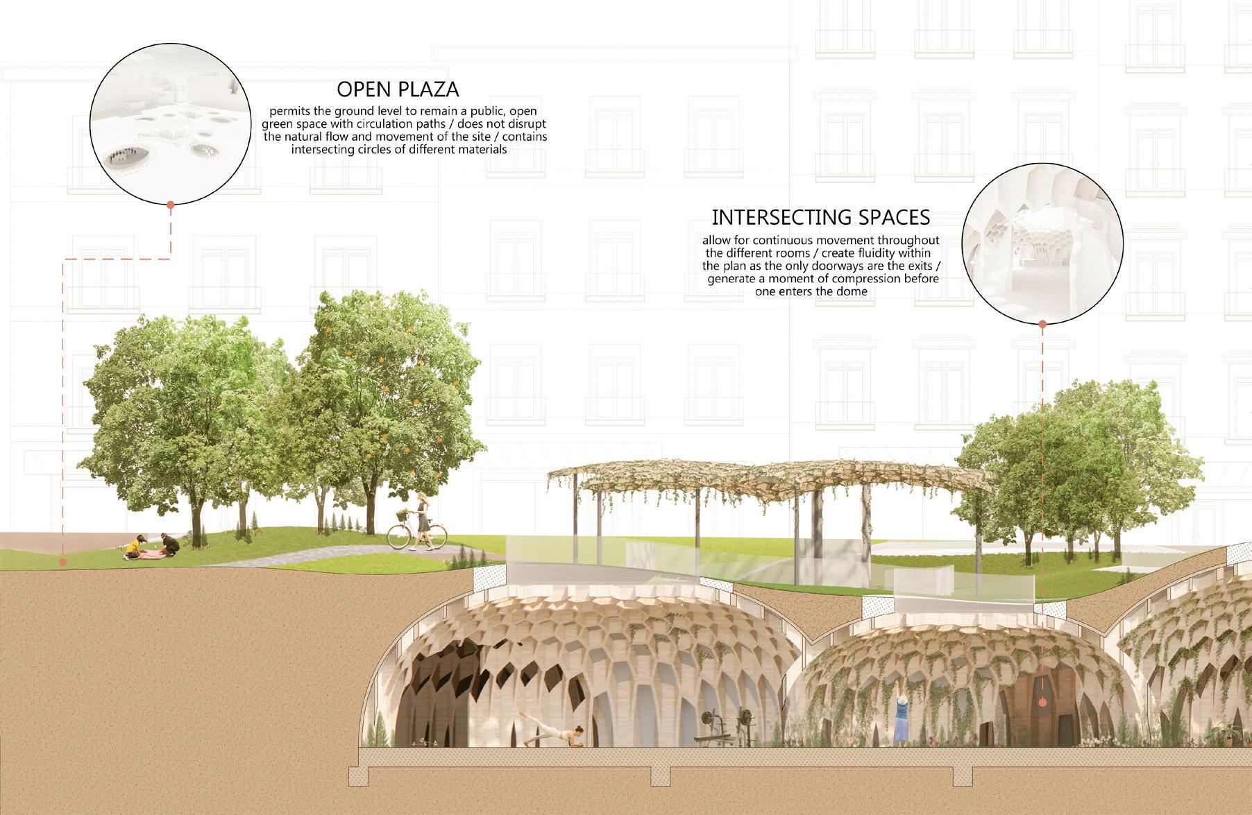 In recent years, Barcelona has made efforts towards becoming a greener city through the implementation of the superblock plan as well as the addition of parks and community squares. In respect for this desire to improve the city and environment, we have designed an underground structure created by a series of overlapping domes. Our design revolves around three main notions: the modularity and process of its construction, the movement between spaces, and the interaction between levels.