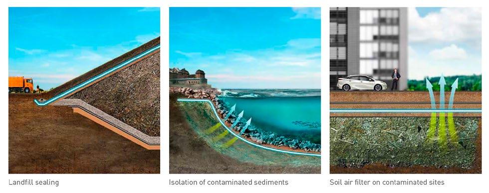 Su aplicación es especialmente ventajosa en zonas donde el acceso es limitado o donde la perturbación del sitio debe minimizarse, como en cuerpos de agua, taludes contaminados o fundaciones industriales activas. Los geocompuestos activos pueden instalarse como coberturas de confinamiento en lagunas de residuos, barreras permeables reactivas o capas de protección sobre sedimentos, según el tipo de contaminante y la estrategia de remediación adoptada.