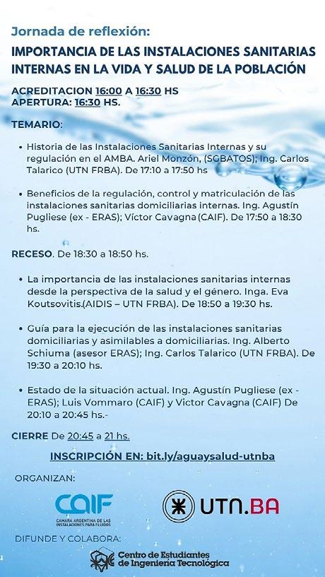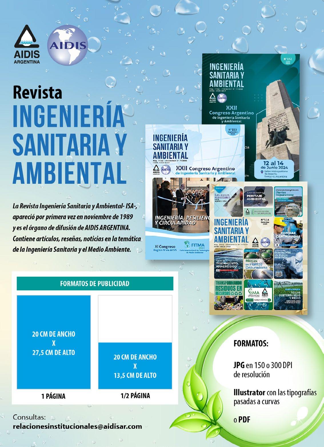 La Revista Ingeniería Sanitaria y Ambiental es una publicación de la Asociación Argentina de Ingeniería Sanitaria y Ciencias del Ambiente, Sección Nacional de AIDIS Interamericana, que se distribuye sin cargo a sus socios y a personas, instituciones y empresas calificadas. Los artículos firmados expresan exclusivamente el criterio de sus autores. Los ofrecimientos, ofertas, especificaciones, etc. que surjan de los avisos comerciales son responsabilidad de los respectivos anunciantes.