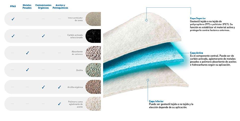 incorporando la capacidad reactiva, y diseñado para adsorber, inmovilizar o degradar contaminantes específicos. Dependiendo del objetivo, el agente activo puede ser carbón activado (para hidrocarburos o compuestos orgánicos persistentes), zeolitas (para amonio y metales), óxidos de hierro (para arsénico), o agentes de intercambio iónico, entre otros. Se puede ir modificando el tipo y la cantidad de componente activo en función del objetivo específico buscado para el tratamiento de cada contaminante en particular. No es un geocompuesto de fabricación estándar por la industria de los geosintéticos, sino que se debe evaluar y diseñar su composición para cada caso particular.