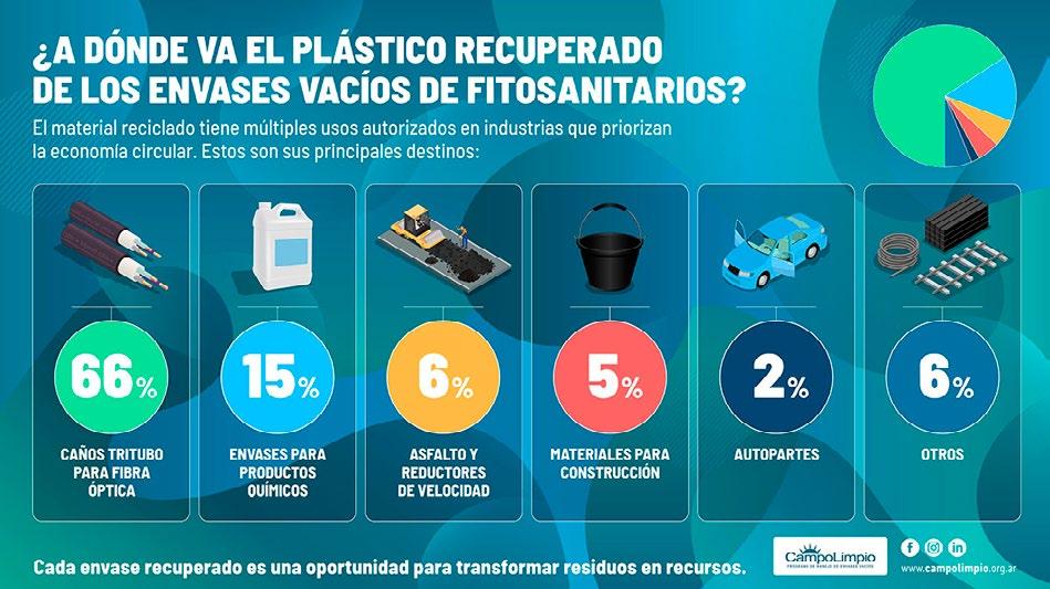 La circularidad del modelo de gestión permite reciclar el plástico recuperado en usos seguros. A la fecha, los envases ya se revalorizan en 19 destinos permitidos; la mayoría en caños tritubo para contener fibra óptica, envases para productos químicos, materiales de la construcción, etc. Esta puesta en valor es posible gracias a la sinergia del sistema con operadores habilitados provincialmente que reciben los envases y los reciclan, transformándolos en materia prima que sirve de insumo a la industria plástica.