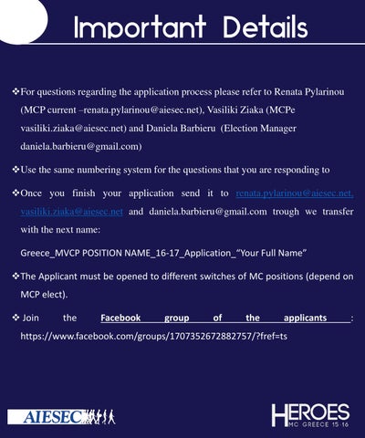 For questions regarding the application process please refer to Renata Pylarinou (MCP current –renata.pylarinou@aiesec.net), Vasiliki Ziaka (MCPe vasiliki.ziaka@aiesec.net) and Daniela Barbieru (Election Manager daniela.barbieru@gmail.com) Use the same numbering system for the questions that you are responding to Once you finish your application send it to renata.pylarinou@aiesec.net, vasiliki.ziaka@aiesec.net and daniela.barbieru@gmail.com trough we transfer with the next name: Greece_MVCP POSITION NAME_16-17_Application_“Your Full Name” The Applicant must be opened to different switches of MC positions (depend on MCP elect). Join