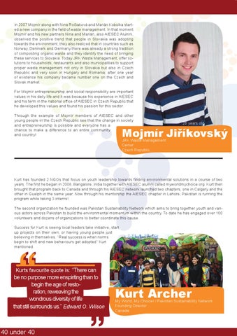 In 2007 Mojmír along with Nina Ročiaková and Marián Kobolka started a new company in the field of waste management. In that moment Mojmír and his new partners Nina and Marián, also AIESEC Alumni, observed the positive trend that people in Slovakia was adopting towards the environment, they also realized that in countries such as Norway, Denmark and Germany there was already a strong tradition of composting organic waste and they identify the need of bringing these services to Slovakia. Today JRK Waste Management, offer solutions to households, restaurants and also municipalities to support proper waste management not only in Slovakia but also in Czech Republic and very soon in Hungary and Romania; after one year of existence his company became number one on the Czech and Slovak market. For Mojmír entrepreneurship and social responsibility are important values in his daily life and it was because his experience in AIESEC and his term in the national office of AIESEC in Czech Republic that he developed this values and found his passion for this sector. Through the example of Mojmír members of AIESEC and other young people in the Czech Republic see that the change in society and entrepreneurship is possible and everyone has a chance to make a difference to an entire community and country! JRK Waste Management Owner Czech Republic