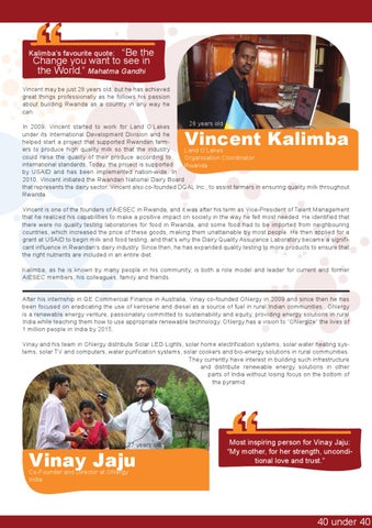 Vincent is one of the founders of AIESEC in Rwanda, and it was after his term as Vice-President of Talent Management that he realized his capabilities to make a positive impact on society in the way he felt most needed. He identified that there were no quality testing laboratories for food in Rwanda, and some food had to be imported from neighbouring countries, which increased the price of these goods, making them unattainable by most people. He then applied for a grant at USAID to begin milk and food testing, and that’s why the Dairy Quality Assurance Laboratory became a significant influence in Rwandan’s dairy industry. Since then, he has expanded quality testing to more products to ensure that the right nutrients are included in an entire diet. Kalimba, as he is known by many people in his community, is both a role model and leader for current and former AIESEC members, his colleagues, family and friends. After his internship in GE Commercial Finance in Australia, Vinay co-founded ONergy in 2009 and since then he has been focused on eradicating the use of kerosene and diesel as a source of fuel in rural Indian communities.. ONergy is a renewable energy venture, passionately committed to sustainability and equity, providing energy solutions in rural India while teaching them how to use appropriate renewable technology. ONergy has a vision to “ONergize” the lives of 1 million people in India by 2015. Vinay and his team in ONergy distribute Solar LED Lights, solar home electrification systems, solar water heating systems, solar TV and computers, water purification systems, solar cookers and bio-energy solutions in rural communities. They currently have interest in building such infrastructure and distribute renewable energy solutions in other parts of India without losing focus on the bottom of the pyramid.