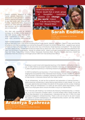 Ardantya is a well known and respected alumnus in the AIESEC community in Indonesia. In 1998-1999 he served as President of AIESEC Indonesia, and during the following 5 years he gained experience in marketing research and advertising companies. In 2005 he started his own business, K-Food Indonesia, which is a small enterprise leveraging the local potential of the Indonesian food industry. He also initiated PT. Marketing Komunikasi Indonesia, a strategic marketing communication and research agency to help brands in Indonesia interact with their target market. “As an entrepreneur, as well as the excitement and adrenaline of making business, I believe being an entrepreneur is about taking responsibility to lead change; it is our job is to seek opportunities and initiate innovations for the people and the society” Ardantya recalls, “Being an entrepreneur is a noble job and carries great responsibility, to take care of our employees and to ensure the better living of our stakeholders.”