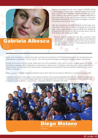 Gabiza, as people know her, was involved in AIESEC during 7 years leading projects first in Romania and Moldova and then in AIESEC International as President for the term 20072008. Gabiza is an agent of positive change, committed to bring new ways of organising communities into structures that effectively generate a sustainable world and a connected humanity as a force for good. After her experience in AIESEC Gabiza joined Future Considerations where she worked in designing and delivering large scale organisational transformation and leadership programmes with key clients across several sector such as TATE Britain, BP, KPMG and HSBC. 28 years old