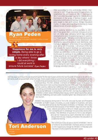 After completing his time working for AIESEC International in 2007, Ryan moved to Hungary where he established his own business, SELTI International. SELTI provides language training for individuals and businesses in the areas of general English, exam preparation and business training. In 2011 Ryan company began a new joint venture, Bridge Education Centre, in Qatar, providing English training to many different levels of society and business. Ryan 27 years old