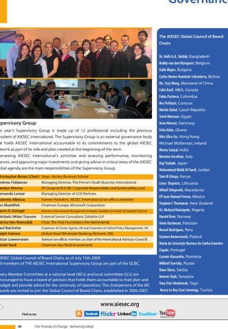 Governance The AIESEC Global Council of Board Chairs Dr. Hafiz G.A. Siddiqi, Bangladesh Robby van den Wyngaert, Belgium Kalin Blajev, Bulgaria Carlos Nemer Numbela Salvatierra, Bolivia Ms. Tzyy Wang, Mainland of China Colin Baril, MBA, Canada Fabio Pacheco, Colombia Bea Pellizari, Conosur Martin Dybal, Czech Republic Tarek Mansour, Egypt