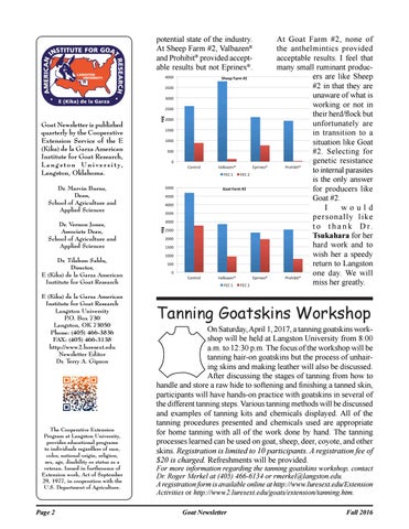 Tanning Goatskins Workshop On Saturday, April 1, 2017, a tanning goatskins workshop will be held at Langston University from 8:00 a.m. to 12:30 p.m. The focus of the workshop will be tanning hair-on goatskins but the process of unhairing skins and making leather will also be discussed. After discussing the stages of tanning from how to handle and store a raw hide to softening and finishing a tanned skin, participants will have hands-on practice with goatskins in several of the different tanning steps. Various tanning methods will be discussed and examples of tanning kits and chemicals displayed. All of the tanning procedures presented and chemicals used are appropriate for home tanning with all of the work done by hand. The tanning processes learned can be used on goat, sheep, deer, coyote, and other skins. Registration is limited to 10 participants. A registration fee of $20 is charged. Refreshments will be provided. For more information regarding the tanning goatskins workshop, contact Dr. Roger Merkel at (405) 466-6134 or rmerkel@langston.edu. A registration form is available online at http://www.luresext.edu/Extension Activities or http://www2.luresext.edu/goats/extension/tanning.htm. Goat Newsletter
