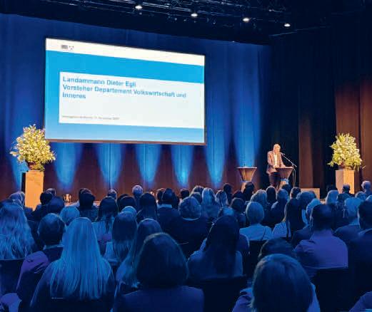Zum zehnten Jubiläum des Arbeitgebendenforums richtete sich Landammann Dieter Egli an die Anwesenden. Anschliessend beleuchteten sechs Fachexpertinnen und Experten das Thema in ihren Referaten von unterschiedlichen Seiten. So wurde aufgezeigt, wo bereits heute KI im Recruiting angewendet werden kann und wo sich deren Einsatz mehr oder weniger lohnt. So können mit künstlicher Intelligenz gewisse Abläufe vereinfacht und effizienter ausgestaltet werden. Ihre Grenzen wurden dagegen auch aufgezeigt: Auch in Zukunft wird die Entscheidung über die Besetzung einer Stelle bei den Menschen liegen, spielen hier doch weitere Faktoren – etwa, wie gut jemand in ein Team passt – eine zentrale Rolle.