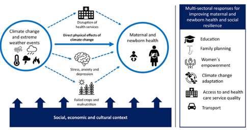 Food shortages caused by climate crises lead to undernourishment in mothers, which poses a high risk of malnutrition in newborns. This could lead to metabolic and developmental disorders in the children Unsafe drinking water is also a major problem caused by the changing climate, which could lead to severe diarrhea and dehydration in the mother Heat shock and increased transmission of vector-borne diseases also prove to be gargantuan threats to maternal health