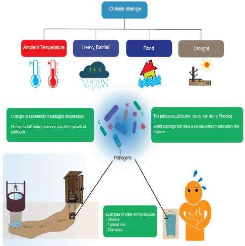 When we talk of gastrointestinal health, the enteric infections play a major role in altering its health. Climate change has been seen to show its effect on these infection-causing pathogens also by various ways in the form of increasing their distribution, multiplication, and resistance to the environment Extreme weather conditions, like floods and excessive rains, also lead to an outbreak of these enteric infections in the affected areas