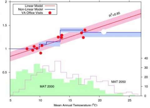 A seemingly unexpected effect of climate change in recent times is the increased prevalence of Urolithiasis in various regions of the US An increase in the spread of high-risk zones in the country is estimated by the linear and non-linear models This results in an increased burden on healthcare