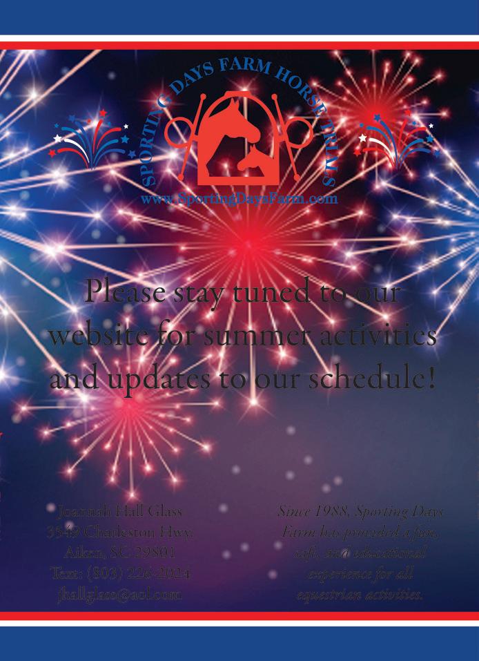 21 July Horse Trials. Full Gallop Farm, 3828 Wagener Rd, Aiken. Lara Anderson: 803.215.6590, fullgallopfarm@yahoo.com
