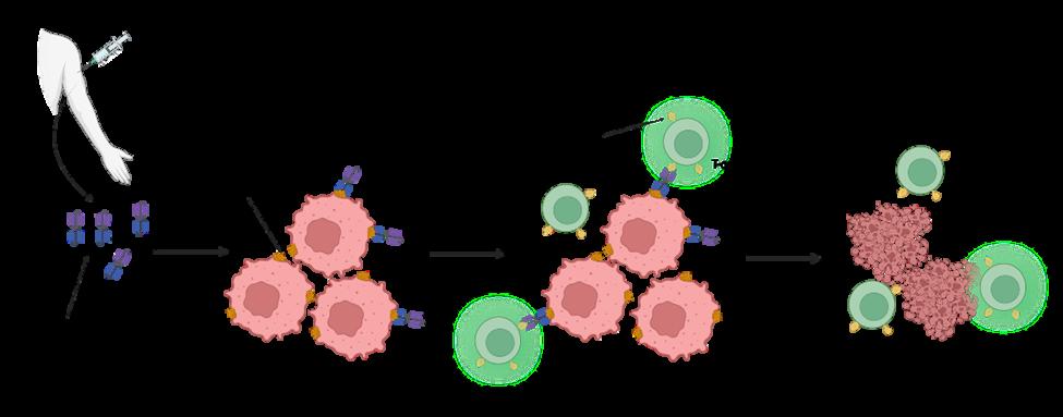 After patients are given the T-cellengagers they circulate through the bloodstream until they come across cancer cells, and their cancer-binding part (blue inpicture) binds to the TAA on the cancer cell surface. After binding to the cancer cell, the T-cell binding part of the T-cell engagerbinds to CD3 on bypassing T-cells and keeps them close to the cancer cell while activating the T-cell. The active T-cell then killsthe cancer cell. (Created with BioRender com)