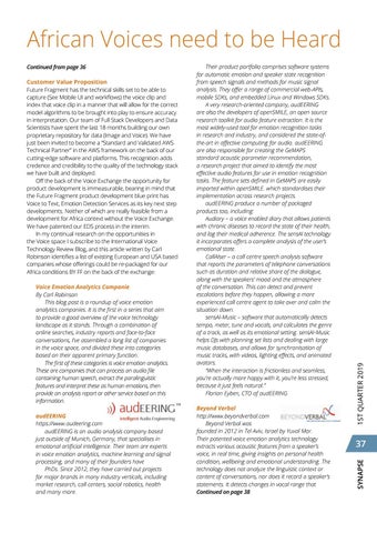 Customer Value Proposition Future Fragment has the technical skills set to be able to capture (See Mobile UI and workflows) the voice clip and index that voice clip in a manner that will allow for the correct model algorithms to be brought into play to ensure accuracy in interpretation. Our team of Full Stack Developers and Data Scientists have spent the last 18 months building our own proprietary repository for data (Image and Voice). We have just been invited to become a “Standard and Validated AWS Technical Partner” in the AWS framework on the back of our cutting-edge software and platforms. This recognition adds credence and credibility to the quality of the technology stack we have built and deployed. Off the back of the Voice Exchange the opportunity for product development is immeasurable, bearing in mind that the Future Fragment product development blue print has Voice to Text, Emotion Detection Services as its key next step developments. Neither of which are really feasible from a development for Africa context without the Voice Exchange. We have patented our EDS process in the interim. In my continual research on the opportunities in the Voice space I subscribe to the International Voice Technology Review Blog, and this article written by Carl Robinson identifies a list of existing European and USA based companies whose offerings could be re-packaged for our Africa conditions BY FF on the back of the exchange: Voice Emotion Analytics Companie By Carl Robinson This blog post is a roundup of voice emotion analytics companies. It is the first in a series that aim to provide a good overview of the voice technology landscape as it stands. Through a combination of online searches, industry reports and face-to-face conversations, I’ve assembled a long list of companies in the voice space, and divided these into categories based on their apparent primary function. The first of these categories is voice emotion analytics. These are companies that can process an audio file containing human speech, extract the paralinguistic features and interpret these as human emotions, then provide an analysis report or other service based on this information. audEERING https://www.audeering.com audEERING is an audio analysis company based just outside of Munich, Germany, that specialises in emotional artificial intelligence. Their team are experts in voice emotion analytics, machine learning and signal processing, and many of their founders have PhDs. Since 2012, they have carried out projects for major brands in many industry verticals, including market research, call centers, social robotics, health and many more.