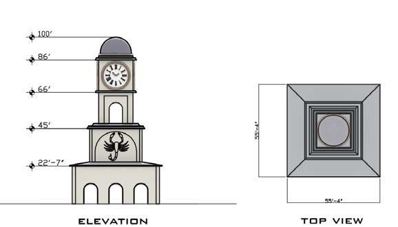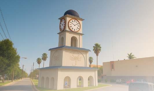 My project is a scorpion-themed clock tower designed to replace the old TSC water tower. The bottom of the tower works as a pavilion with open arches, creating a shaded space for students to gather Above, the tower r ses with large clock faces that are visible across campus I included the scorpion logo to highl ght Texas Southmost College’s pr de and identity, making the design both symbolic and practical. The clock tower w ll serve as a functional timekeeper, a pavilion for community use, and a landmark that represents TSC’s strength and spir t.