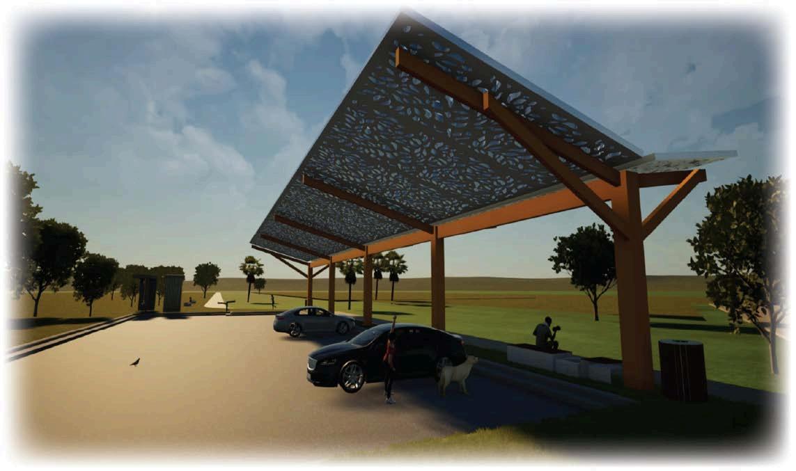 Nestled between Burns Elementary School and Beacon Building Products, the Alton Gloor Trail serves as both a natural corridor and a source of inspiration for architectural design The surrounding landscape dense with locally grown trees shaped the vision for the structure, echoing the form and texture of traditional huts rooted in the environment The roof will be crafted from wood, a material sourced from the area tself, reinforcing a sense of connection between the structure and its surroundings