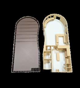Drawing from the architectural language of the Halle du Conservatoire des Mécan ques, the design features an expressive overhanging roof The use of a butterfly roof and layered wooden trusses throughout the bu lding further enhances this dynamic yet grounded form Another key influence was the Covered Bridge on Aqueduct, whose blend of wood and aluminum panels harmonizes beautifully with the natural landscape Echoing this, the design incorporates laser-cut panels intended to mimic the exper ence of standing beneath a canopy of trees where sunlight filters through, casting ever-changing, dappled patterns of leaves across thespace.