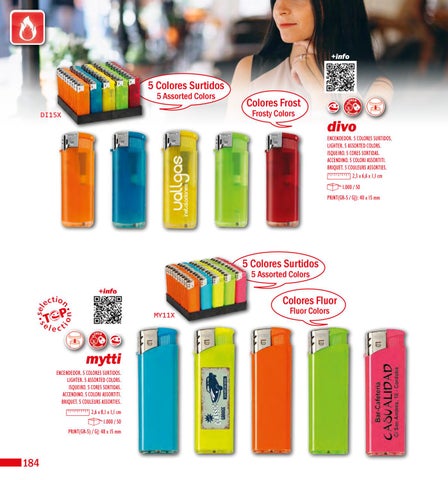 ENCENDEDOR. 5 COLORES SURTIDOS. LIGHTER. 5 ASSORTED COLORS. ISQUEIRO. 5 CORES SORTIDAS. ACCENDINO. 5 COLORI ASSORTITI. BRIQUET. 5 COULEURS ASSORTIES. 2,3 x 6,6 x 1,1 cm 1.000 / 50 PRINT(GR-5 / GJ): 40 x 15 mm