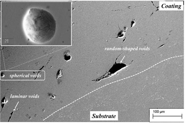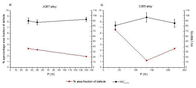 The microstructural analysis indicates that irrespective of the discharge power employed, all coatings exhibit a very fine microstructural morphology attributed to rapid solidification. Furthermore, experimental findings reveal that all coatings exhibit defects, manifested in the form of various morphologies of voids. Additionally, unlike the A357 samples, the C355 samples display cracks at the interface between the substrate/coating, extending into the base material. The defects percentage within the A357 and C355 coatings, primarily attributed to mass transport and stress thermal, is less than 4 and 8%, respectively. Finally, microhardness values in all coatings, irrespective of discharge powersettings,arelowerthanthesubstratematerial.Thisisprimarilyattributedtothepresenceofinternaldefects.