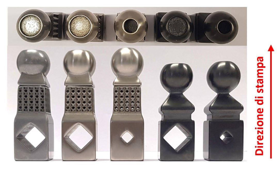 nella fase di rivestimento (foro cilindrico in testa, foro romboidalenelcorpo,strutturereticolari,comemostrato in Fig. 1). Le geometrie sono state distinte in: (i) “critica”, dove i sopracitati aspetti di criticità sono estremizzati e (ii) “non critica”, in cui sono più smorzati. La stampa è avvenuta in atmosfera controllata (Ar ad alta purezza con livello di O2 inferiore allo 0,1 vol.%), utilizzando una piattaforma riscaldata (100 °C) in modo da ridurre gli effetti delle tensioni residue. Per la produzione dei provinièstataadottataunastrategiadiscansioneastrisce parallele con rotazione di 67° tra layer successivi, oltre ai seguenti parametri di stampa: (i) potenza laser: 195 W, (ii) velocità di scansione: 800 mms-1, (iii) spessore