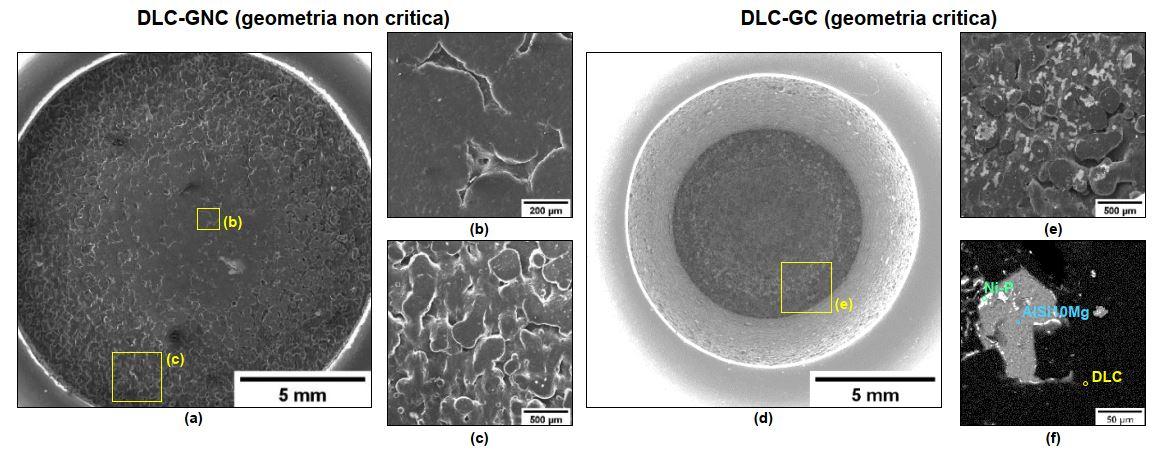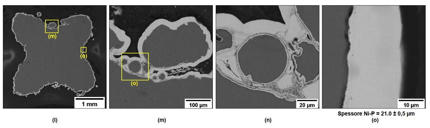 Il rivestimento multistrato Ni-P+(a-C:H) DLC (costituito da un interstrato in lega Ni-P depositato per via chimica autocatalitica da fase liquida, seguito da un rivestimento in carbonio amorfo idrogenato simil-diamante depositato da fase vapore) si inserisce molto bene in questo contesto. Questa soluzione garantisce la piena compatibilità delle condizioni di deposizione (tempo e temperatura) del rivestimento multistrato con la microstruttura metastabile della lega PBF-LB AlSi10Mg [9], l’integrazione con eventuali cicli di trattamento termico per l’ottimizzazione delle proprietà meccaniche del substrato [9], e una buona adesione e continuità indipendentemente dall'orientamento di stampa [10]. In applicazioni quali gli scambiatori di calore, il rivestimento Ni-P presenta il vantaggio di poter rivestire uniformemente anche i canali interni nelle strutture reticolari prodotte mediante PBF-LB [11] grazie all'elevato potere penetrante della deposizione chimica autocatalitica [12]. Al tempo stesso, la deposizione di un topcoat quale (a-C:H) DLC può garantire un miglioramento delle proprietà tribologiche grazie alle sue peculiari caratteristiche [13]. Come dimostrato in un precedente lavoro [9], questa soluzione può essere applicata con successo sulla lega PBF-LB AlSi10Mg, garantendo una buona adesione su superfici lavorate e migliorando la resistenza a fatica del materiale. Il rivestimento Ni-P+DLC può permettere di superare le limitazioni microstrutturali e topografiche indotte dal processo PBF-LB, quali l’alta rugosità superficiale e l’elevata densità di difetti presenti in superficie, che