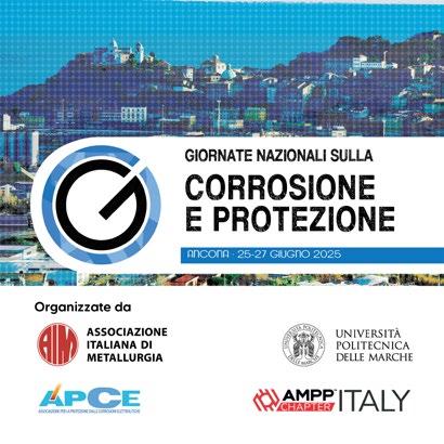 Si terranno inoltre le Giornate Nazionali sulla Corrosione e Protezione - XVI edizione (Ancona 25-27 giugno 2025), EFC event no. 525, presiedute dal prof. Tiziano Bellezze e organizzate in collaborazione con l’Università Politecnica delle Marche, l’Associazione per la Protezione dalle Corrosioni Elettrolitiche (APCE) e l’AMPP Italy Chapter. La manifestazione è supportata da numerose associazioni. Le Giornate Nazionali sulla Corrosione e Protezione si sono tenute per la prima volta a Milano nel 1992 e attualmente hanno una cadenza biennale. Rappresentano l’evento di riferimento a livello nazionale per la discussione ed il confronto sulle questioni scientifiche, tecnologiche e produttive nell’ambito della corrosione e protezione dei materiali. Nel corso della conferenza sarà presente uno spazio per espositori e sarà conferito un premio riservato a giovani ricercatori (studenti di Dottorato di ricerca o giovani ricercatori post-dottorato) in memoria della Prof. Cecilia Monticelli. (https://www.aimnet.it/manifestazione. php?id=852&idc=3)
