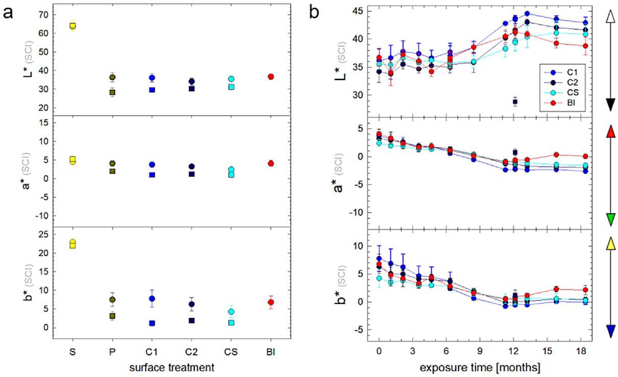 Fig.2 - Evoluzione del colore per i campioni (cerchi) e le lastre (quadrato) a) per le diverse finiture superficiali (S-sabbiata; P-Patinata; C1, C2, CS, BI protetta con i diversi prodotti); b) in funzione del tempo di invecchiamento naturale / Color data for coupons (circle) and slates (square) according to a) different surface finishing (S-sandblasted; P-patinated, C1, C2, CS, BI coated with the corresponding treatment); b) weathering time.