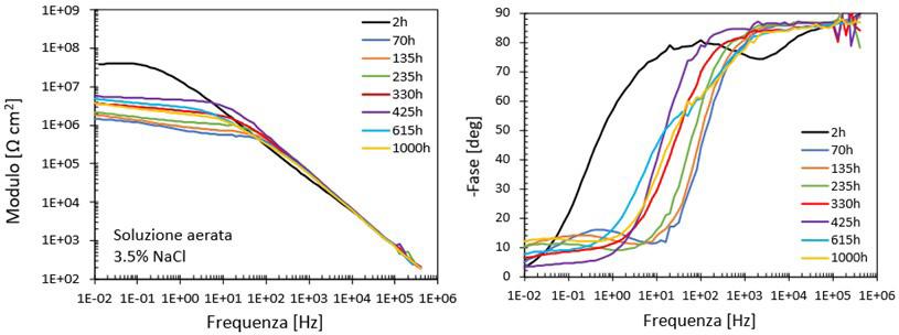 Nel corso dell’esposizione in ambiente marino, si può osservare una variazione di colore che diventa decisamente percepibile nell’arco di 6-12 mesi per tutti i protettivi (Fig.2b); dopo 18 mesi, i campioni trattati con C1 e C2 sono quelli con una variazione di colore più marcata, seguiti da CS mentre quelli trattati con BI mostrano la variazione minore, comunque percepibile. Da un punto di vista del potere protettivo (Fig.3b) , si può osservare che dopo 18 mesi di esposizione tutti i campioni mantengono un valore di Rp di un ordine di grandezza maggiore rispetto a quanto misurato dopo la patinatura artificiale, con andamenti diversi nel tempo per i diversi protettivi applicati: quelli trattati con C2, inizialmente caratterizzati dai valori più alti sono soggetti a un calo più deciso che li porta in 18 mesi agli stessi valori di quelli con C1 (caratterizzati inizialmen-