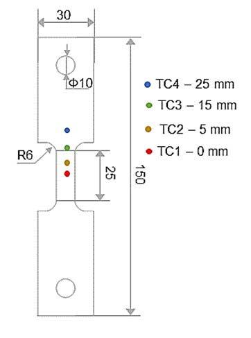 controlled using a K thermocouple, referred to as the pilot thermocouple, welded at the center of the sample (TC1) and connected to a proportional-integral-derivative (PID) controller. This system, comparing the set temperature with that measured on the sample, sends a signal to increase or decrease the voltage, ensuring that the sample temperature matches the set value. Three additional K thermocouples were welded at specific distances from the center of the sample: 5 mm (TC2), 15 mm (TC3), and 25 mm (TC4). These allow monitoring the temperature