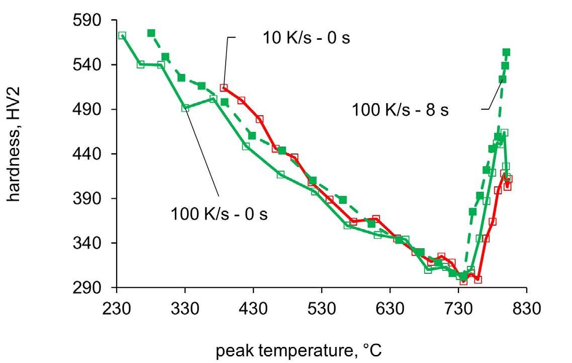 in determining the hardness of the material after the treatment, while the heating rate has a minor effect. The hardness does not follow a monotonous trend with respect to temperature. Instead, as the peak temperature —and thus the tempering temperature— increases, the hardness initially decreases, reaches a minimum point, and then rises again. This indicates that near the turning point of the hardness profile, a condition of maximum softening is achieved. Specifically, the minimum hardness value is approximately 300 ± 3 HV2, independent of the heating rate. This corresponds to a softening of more than 50% compared to the initial martensitic hardness of 633 HV2. It is noteworthy that maximum softening occurs for all three cycles at temperatures close to 730 °C, which is near the eutectoid temperature for C-steels.