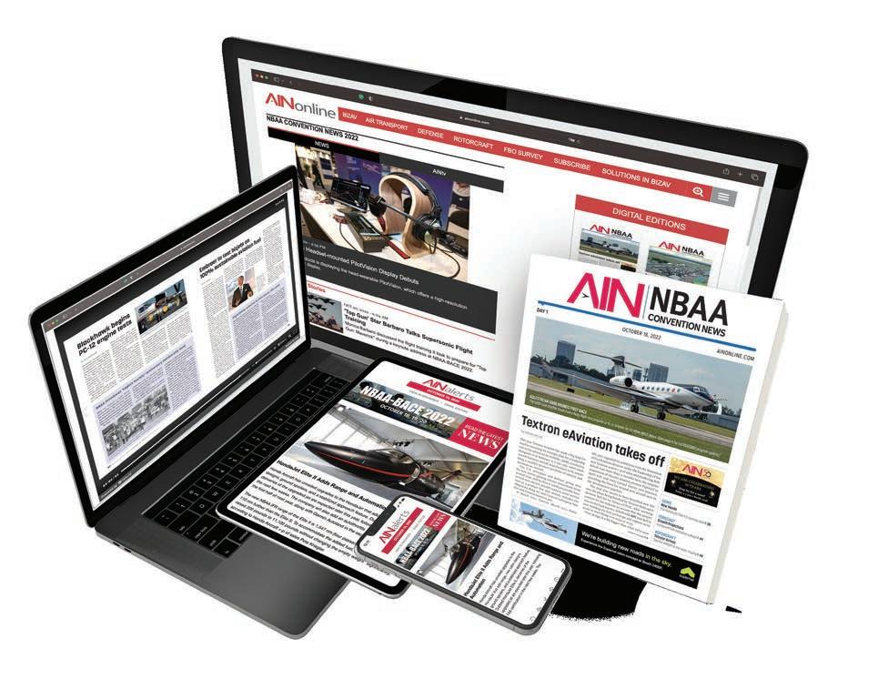 Aviation International News is a publication of AIN Media Group, 214 Franklin Ave., Midland Park, NJ 07432; Tel.: +1 (201) 444-5075. Copyright © 2021 All rights reserved. Reproduction in whole or in part without permission of The Convention News Co., Inc. is strictly prohibited. The Convention News Co., Inc. publishes Aviation International News, AINalerts, AIN Air Transport Perspective, AINtv, Business Jet Traveler, BJTwaypoints, ABACE Convention News, Dubai Airshow News, EBACE Convention News, Farnborough Airshow News, FutureFlight.aero, HAI Convention News, LABACE Convention News, MEBA Convention News, NBAA Convention News, Paris Airshow News, Singapore Airshow News, Mobile Apps: Aviation International News; AINonline. PUBLICATION MAIL AGREEMENT NO. 40649046 RETURN UNDELIVERABLE CANADIAN ADDRESSES TO: PITNEY BOWES INTERNATIONAL MAIL, STATION A, P.O. BOX 54, WINDSOR, ON, N9A 6J5, returns il@imex.pb.com.