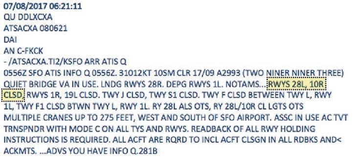 arrival. The closed runway notam was on page eight of a 27-page briefing package in a section titled “Runway” and came after 14 clearly less urgent notams. Six of these were for OBST CRANE, none of which intruded into the flight path for Runway 28R. Two were for taxilane closures, three for taxiway closures, and one for taxiway CL LGT U/S, which means “centerline lights unserviceable” in notam-speak.