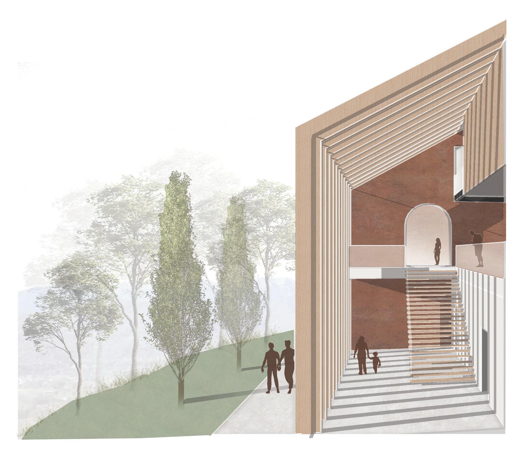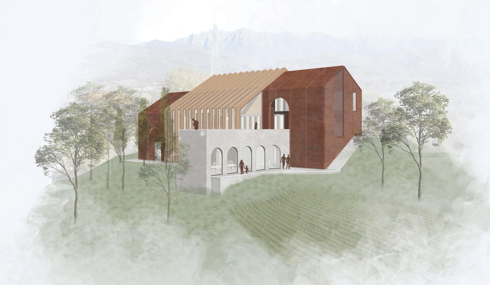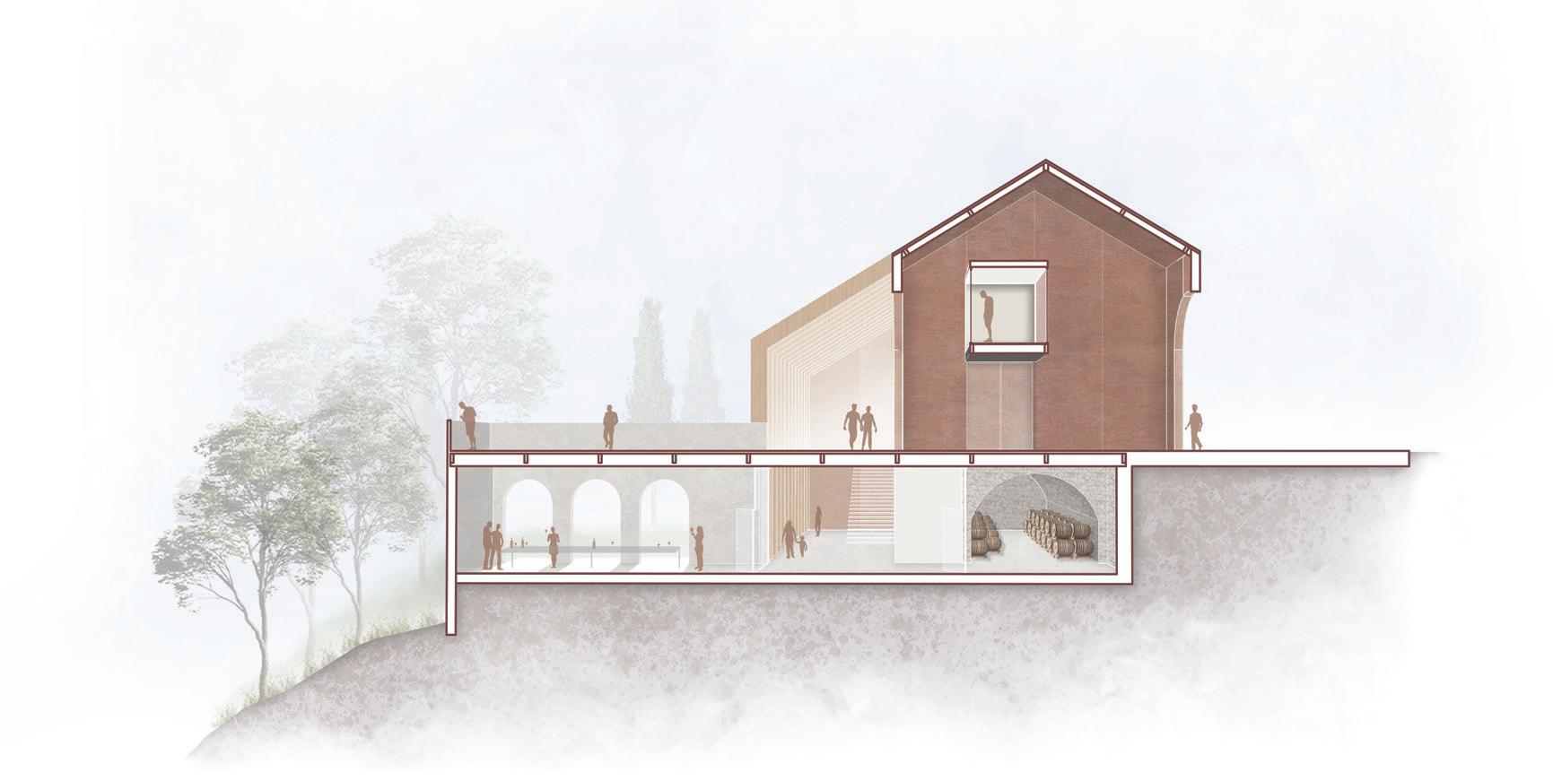 En la región de Lunigiana, en medio de la campiña toscana, surge un proyecto de centro cultural vitivinícola entre los viñedos. El proyecto se integra a su entorno, adaptándose a la topografía del terreno. Un volumen de acero corten, que recuerda el color del vino, está dividido en dos y atravesado por una estructura central de pórticos de madera que conecta la parte superior del terreno con la parte inferior. Como una botella de vino que hubiera sido perforada, el proyecto revela el interior del edificio, creando un contraste entre la opacidad del acero corten y la transparencia y ligereza de la estructura central. En medio de este volumen, emerge un tercer elemento central: la pasarela. Una plataforma atraviesa el edificio hacia el exterior, ofreciendo una vista de los viñedos al rededor.