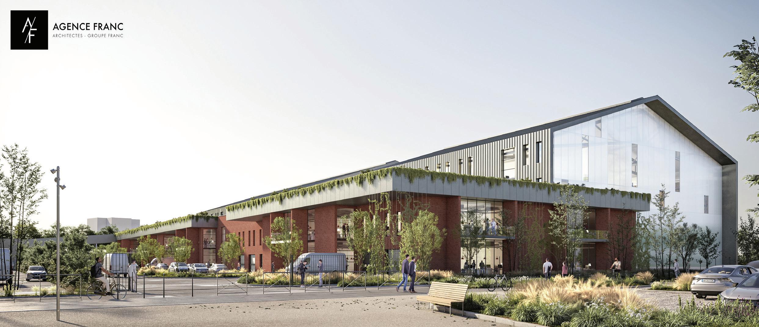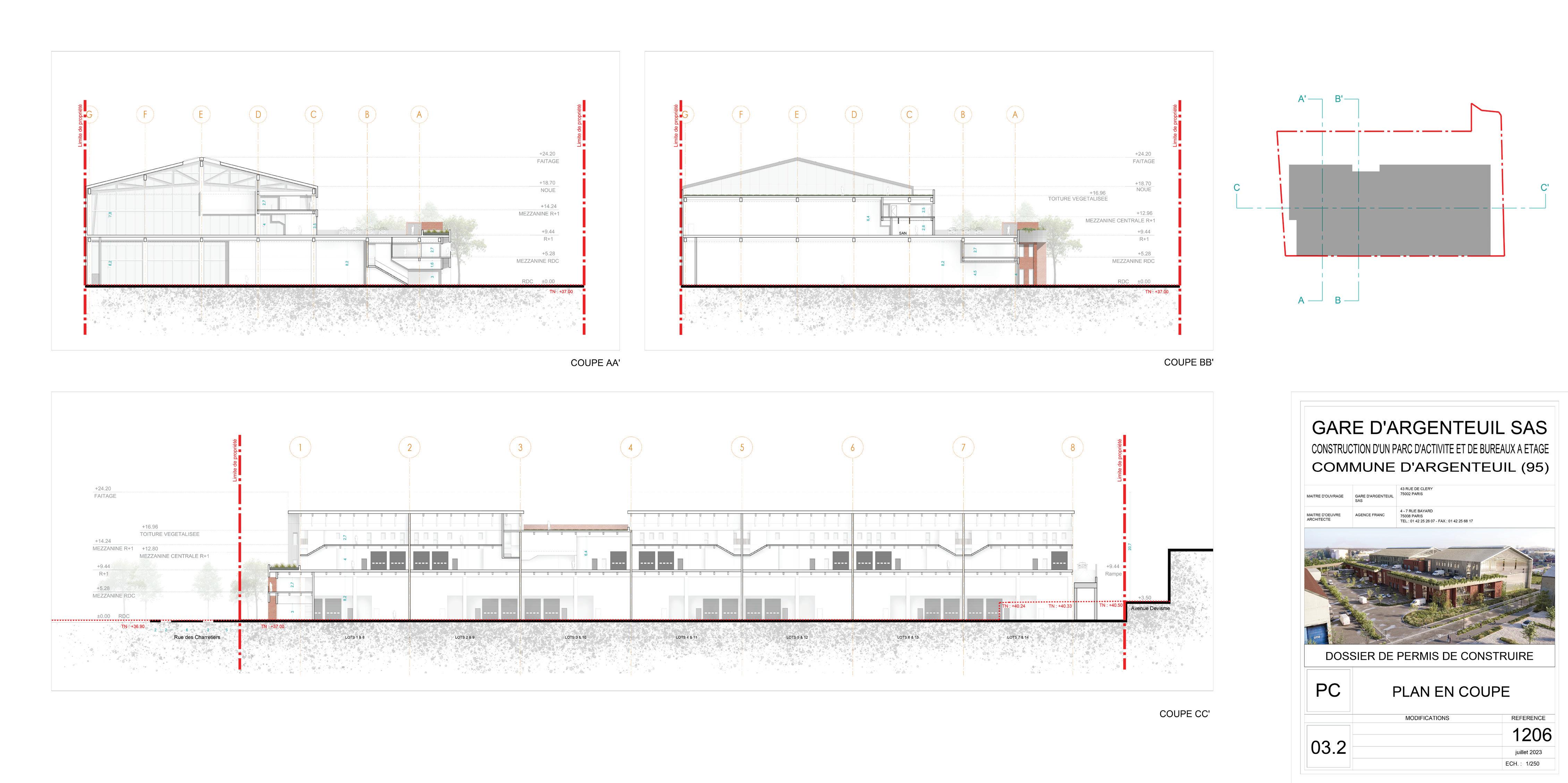 Cerca de las orillas del Sena, a pocos kilómetros de París, un edificio surge en el tejido urbano de la ciudad de Argenteuil. Un primer volumen hecho de ladrillo deja entrever espacios de oficinas a través de unas finas aberturas verticales, haciendo eco del pasado industrial de la zona. Más arriba, una cubierta metálica se apoya sobre la construcción. Un frontón hecho de policarbonato deja entrever la estructura metálica que sostiene el edificio, al tiempo que aporta luz natural a los espacios de trabajo en el interior. La materialidad de la cubierta y la ligereza del volumen contrastan con la base, de aspecto más robusto. Este juego de volúmenes, combinado con el estudio estructural adecuado, permite la creación de un edificio industrial de dos plantas, accesible en coche en los dos niveles, y con zonas verdes en cada una de las plantas del proyecto (jardineras, tejado vegetalizado, etc.).